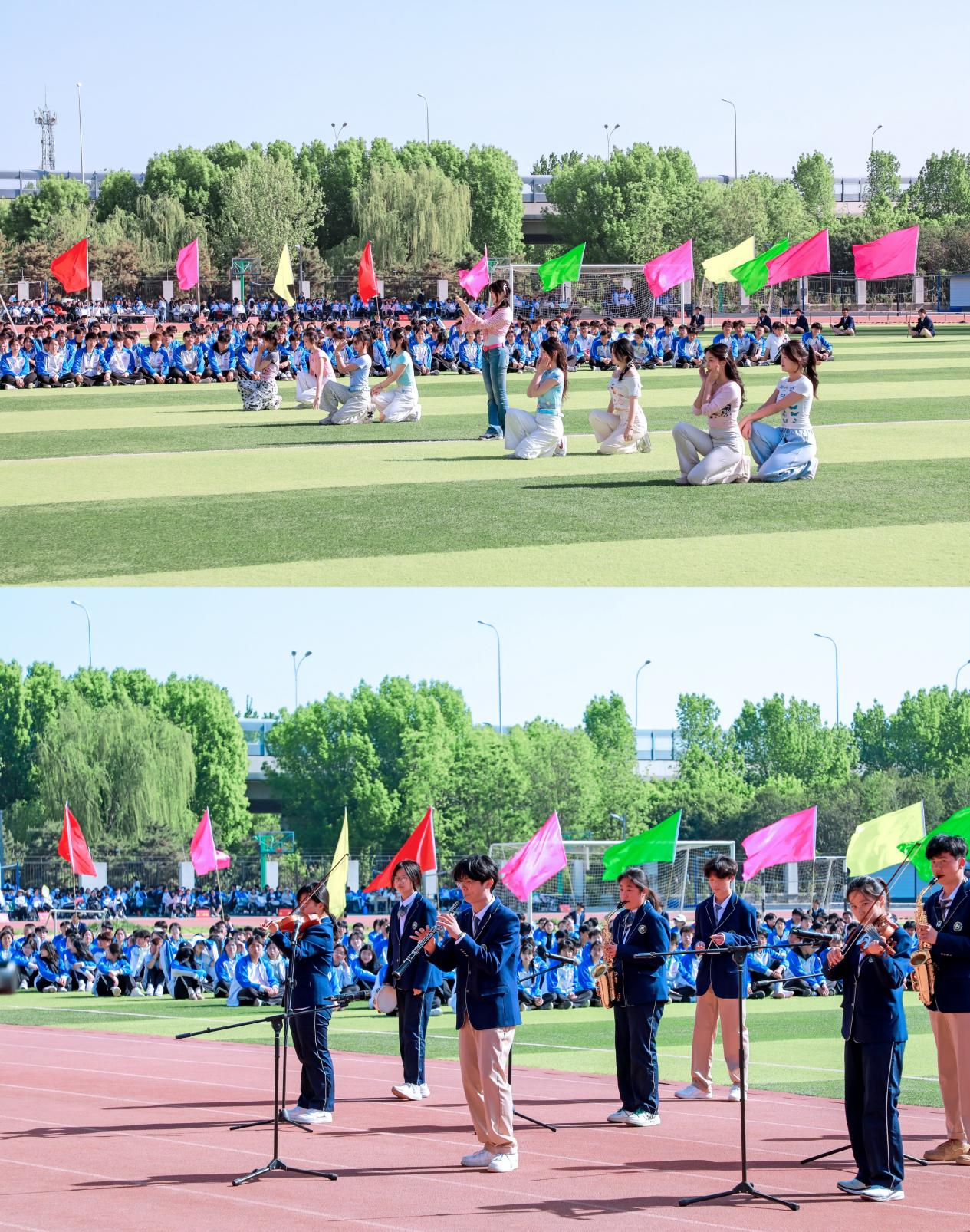 随后,裁判员代表和运动员代表分别进行宣誓。随着肖贤龙校长宣布运动会开幕,全场响起热烈的掌声与欢呼声。本次开幕式我校特别邀请到星光大道歌手徐红。她以极具感染力的嗓音和精彩的舞台表现,为师生们带来经典歌曲《五星红旗》,将现场气氛推向高潮。